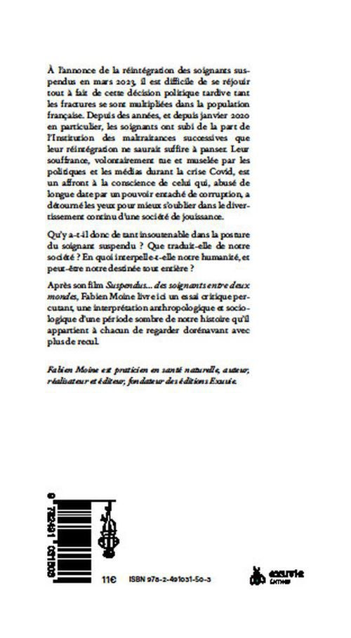 À l’annonce de la réintégration des soignants suspendus en mars 2023, il est difficile de se réjouir tout à fait de cette décision politique tardive tant les fractures se sont multipliées dans la population française. Depuis des années, et depuis janvier 2020 en particulier, les soignants ont subi de la part de l’Institution des maltraitances successives que leur réintégration ne saurait suffire à panser. Leur souffrance, volontairement tue et muselée par les politiques et les médias durant la crise Covid, est un affront à la conscience de celui qui, abusé de longue date par un pouvoir entaché de corruption, a détourné les yeux pour mieux s’oublier dans le divertissement continu d’une société de jouissance. Qu’y a-t-il donc de tant insoutenable dans la posture du soignant suspendu ? Que traduit-elle de notre société ? En quoi interpelle-t-elle notre humanité, et peut-être notre destinée tout entière ? Après son film « Suspendus… des soignants entre deux mondes », Fabien Moine livre ici un essai critique percutant, une interprétation anthropologique et sociologique d’une période sombre de notre histoire qu’il appartient à chacun de regarder dorénavant avec plus de recul. Fabien Moine est praticien en santé naturelle, auteur, réalisateur et éditeur, fondateur des éditions Exuvie. Les droits d’auteur de ce livre seront reversés aux soignants suspendus.